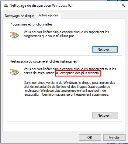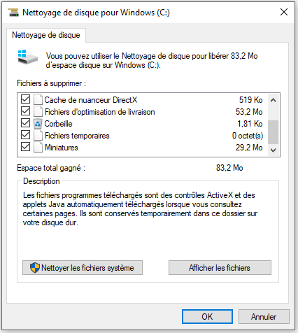 Le Nettoyage de disque (outil intégré) permet de les supprimer en toute sécurité et de libérer encore plusieurs gigaoctets.