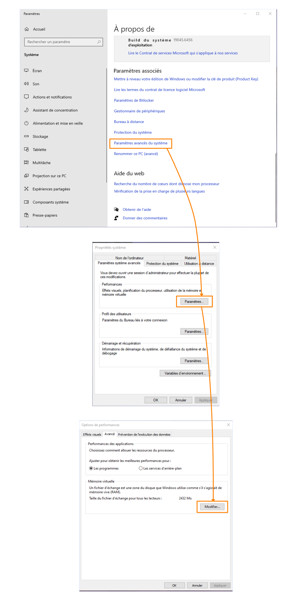 Ensuite, allez dans : Système → Paramètres avancés du système → Performances → avancé → Mémoire virtuelle et cliquez sur « modifier »