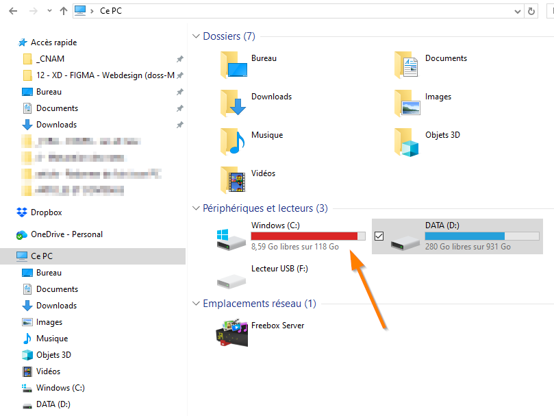 👉 Ouvrez l’Explorateur de fichiers, cliquez sur Ce PC, puis regardez la jauge du disque C. Si elle est rouge, il faut agir.